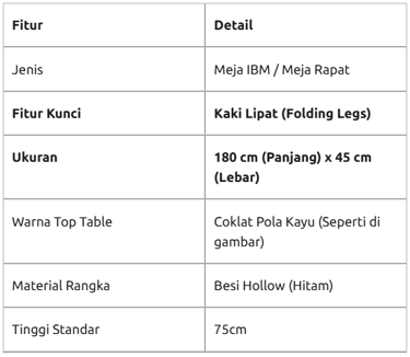 Favorit klien kami adalah ukuran 180 x 45 cm. Ukuran ini sering disebut sebagai "Meja Classroom" karena bentuknya yang ramping namun panjang, sangat efisien untuk memaksimalkan kapasitas peserta di dalam ruangan hotel atau kantor yang terbatas.