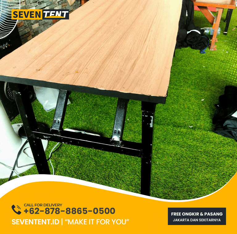 Sewa meja kaki lipat Jakarta di Seventent.id menyediakan meja IBM modular dengan dua ukuran standar: 180 x 45cm Meja ini menggunakan rangka besi wishbone yang stabil dan permukaan kayu multiplex berlapis HPL yang bersih. Kami melayani seluruh wilayah Jakarta dengan jaminan meja tidak goyang, pengiriman tepat waktu, dan tersedia ribuan unit untuk kebutuhan skala besar.