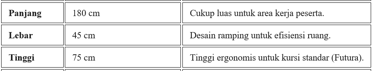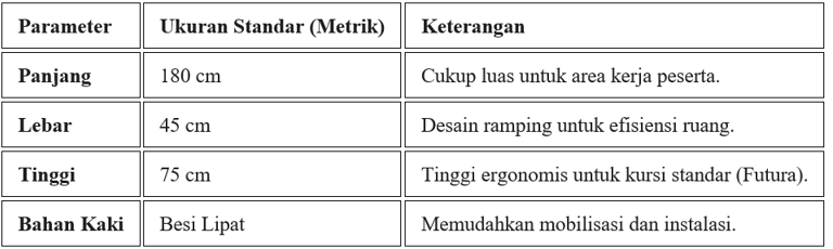 Ukuran standar meja IBM adalah panjang 180 cm, lebar 45 cm, dan tinggi 75 cm. Meja ini dirancang khusus dengan profil ramping untuk memaksimalkan ruang pada pengaturan classroom atau rapat, sehingga memungkinkan peserta memiliki ruang kerja yang cukup tanpa memakan banyak tempat.