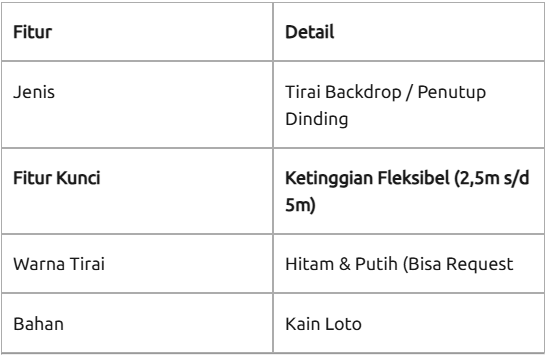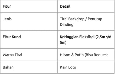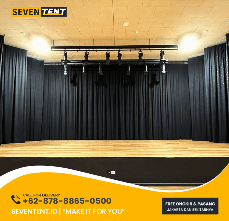 Pipe and Drape System: Kami menggunakan sistem rangka pipa aluminium yang stabil, sehingga tirai setinggi 6 Meter sekalipun tetap aman berdiri tanpa perlu dipaku ke dinding gedung.