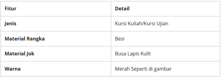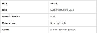 Kapasitas Beban: Meskipun tampak ramping, kursi kuliah standar mampu menahan beban statis hingga 100 kg - 120 kg.