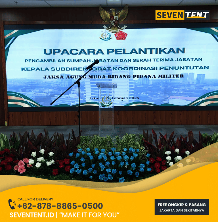 Sewa backdrop Jakarta di Seventent.id melayani pembuatan backdrop custom, Layanan kami sudah termasuk transportasi, biaya pasang-bongkar (set-up & teardown), serta gratis lampu sorot (spotlight) untuk area Jakarta Pusat, Selatan, Barat, Timur, dan Utara.