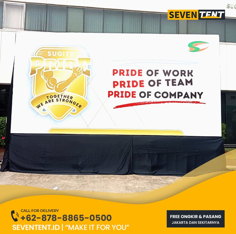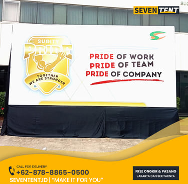 Sewa backdrop kayu Depok di Seventent.id menyediakan rangka latar belakang menggunakan kayu kaso atau multiplek berkualitas tinggi yang memiliki karakteristik sangat stabil (heavy-duty). Kami melayani wilayah Margonda, Beji, Sawangan, hingga Cimanggis.