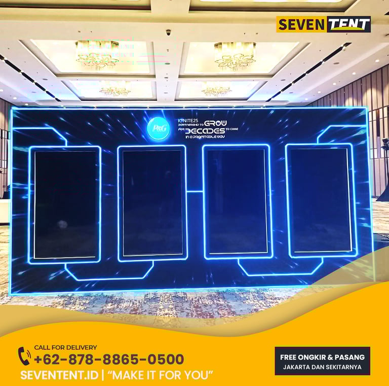 Sewa background Tangerang Selatan di Seventent.id menyediakan jasa pembuatan latar belakang menggunakan media cetak Flexi Korea, kain Muslin, atau panel kayu/akrilik. Memiliki karakteristik permukaan yang tidak memantulkan cahaya (non-reflective) dan rangka besi heavy-duty yang stabil. Kami melayani seluruh wilayah Tangerang Selatan (BSD, Bintaro, Serpong, Pamulang, Ciputat).