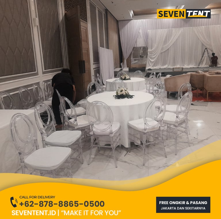 Sewa kursi akrilik di Karawang umumnya menggunakan tipe Kursi Tiffany Akrilik, Ghost Chair, atau Phoenix Chair transparan. Karakteristik utamanya meliputi material polikarbonat premium yang jernih, desain tanpa sambungan baut yang terlihat, dan sifat tahan air (waterproof). Dari sisi durability, kursi akrilik kami mampu menahan beban hingga 100 kg dengan kestabilan tinggi. Seventent.id melayani wilayah Karawang Barat, Timur, hingga kawasan industri dengan unit yang jernih, bebas gores, dan siap pakai.