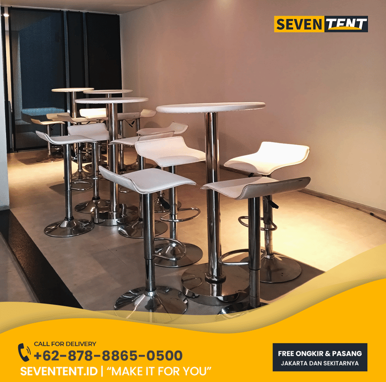Cari sewa kursi barstool di Jakarta? Seventent.id menyediakan kursi bar hidrolik & Tolix kualitas premium. Barang bersih, kokoh, & minimalis. Cocok untuk booth pameran & event VIP. Kirim cepat ke seluruh Jakarta, Jakarta Utara, Jakarta Timur, Jakarta Selatan, Jakarta Barat, Jakarta Pusat. Cek harga sewa kursi barstool terbaru 2026 dan amankan stok event Anda di sini!