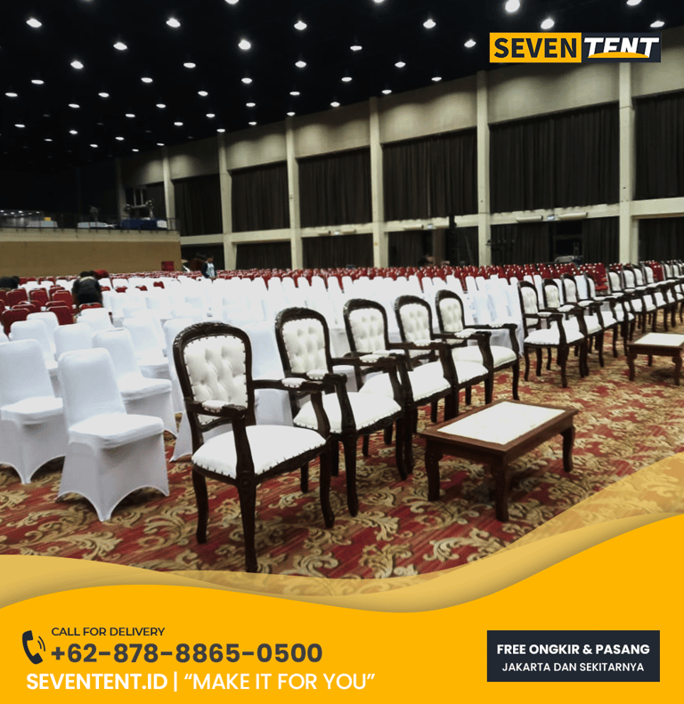 Sewa kursi VIP kayu Bekasi di Seventent.id menyediakan koleksi kursi premium seperti Kursi Tiffany, Kursi Crossback, dan Kursi Royal yang terbuat dari kayu mahoni solid. Memiliki karakteristik serat kayu yang halus, finishing cat anti-kelupas, dan dilengkapi bantalan (cushion) empuk yang higienis. Kami melayani wilayah Bekasi Kota, Tambun, hingga Cikarang
