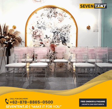 Sewa kursi Tiffany Depok di Seventent.id menyediakan kursi dekorasi premium dengan pilihan warna Gold, Silver, Putih, Hitam, hingga Natural (Wood). Terbuat dari material kayu mahoni pilihan atau resin berkualitas tinggi, kursi ini memiliki karakteristik ringan namun sangat kokoh dengan kapasitas beban hingga 150 kg. Setiap unit sudah termasuk bantal duduk (cushion) empuk yang bersih.