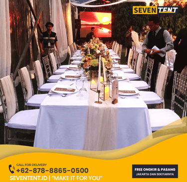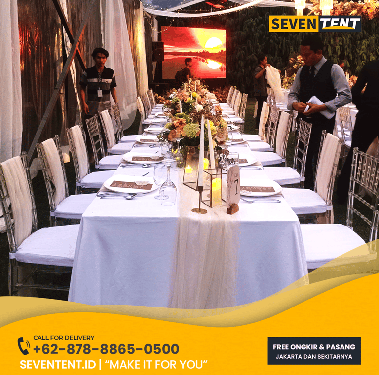 Menyiapkan event besar tentu melelahkan jika Anda harus mengurus logistik sendirian. Seventent.id hadir sebagai partner terpercaya untuk kebutuhan furnitur acara Anda: