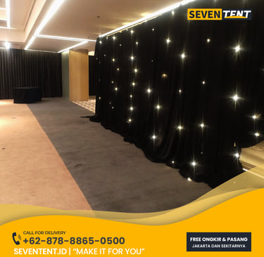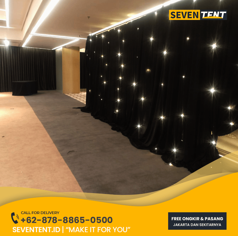 Sewa tirai fairy light Jakarta di Seventent.id menyediakan rangkaian lampu LED dekoratif, Rangkaian lampu kami menggunakan kabel tembaga berkualitas tinggi yang aman dari panas berlebih. Layanan kami sudah termasuk rangka penyangga (standing frame), kabel instalasi, dan teknisi pasang-bongkar untuk seluruh wilayah Jakarta.