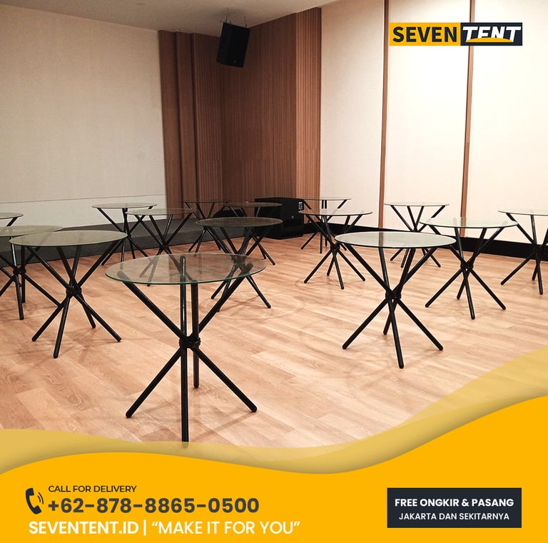 Sewa meja dealing Tangerang Selatan di Seventent.id menyediakan meja diskusi minimalis dengan pilihan top table kaca transparan atau kayu premium. Memiliki karakteristik rangka besi chrome yang mengkilap, Kami melayani seluruh wilayah Tangerang Selatan (BSD, Bintaro, Serpong, Pamulang, Ciputat).