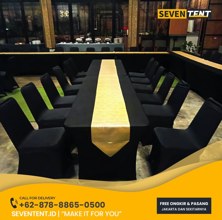 Sewa meja IBM Jakarta di Seventent.id menyediakan meja lipat persegi panjang standar industri, Layanan kami sudah termasuk opsi pemasangan taplak meja (cover) dan skirting rapi, siap dikirim ke seluruh wilayah Jakarta.