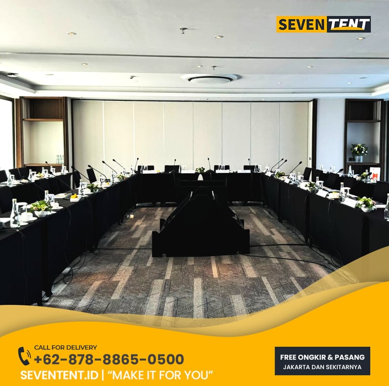 Butuh sewa meja meeting Jabodetabek yang kokoh & profesional? Seventent.id menyediakan rental meja IBM & meja rapat kualitas premium. Unit bersih, taplak rapi, & siap antar ke Jakarta hingga Cikarang. Cek promo harga 2026 & hadirkan produktivitas di setiap diskusi tim Anda di sini!