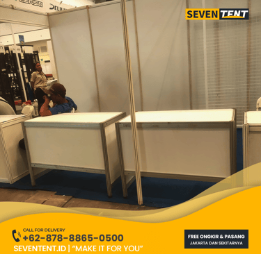 Sewa meja R8 Depok di Seventent.id menyediakan meja modular berbahan rangka Aluminum Octagonal R8 System dengan panel dinding PVC putih. Kami melayani wilayah Margonda, Beji, Cimanggis, hingga Sawangan.