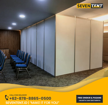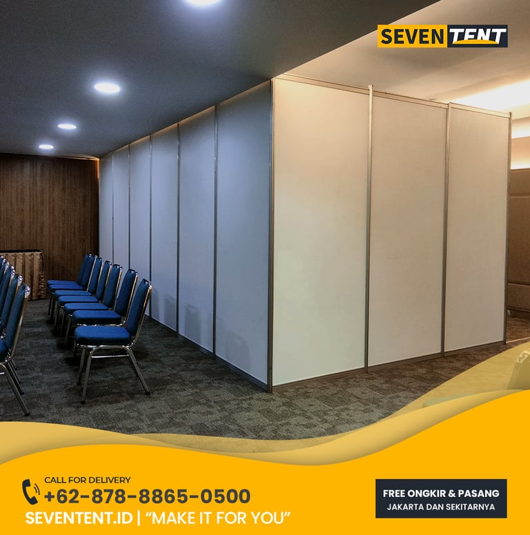 Sewa partisi paketan di Karawang menawarkan solusi pameran siap pakai dengan ukuran standar 2x2 meter atau 3x3 meter. Paket ini umumnya mencakup rangka aluminium R8, panel laminasi putih, 1 meja deal, 2 kursi lipat/futura, lampu TL, dan MCB listrik. Dari sisi durability, sistem modular ini sangat stabil dan mampu menahan beban display pameran. Seventent.id melayani wilayah Karawang Barat, Timur, hingga seluruh kawasan industri utama.