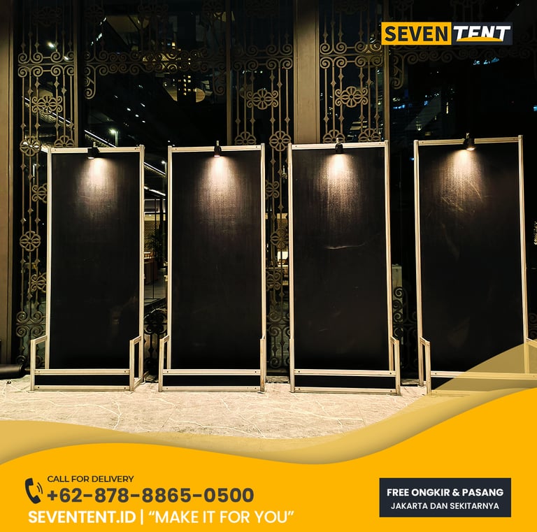 Sewa panel pameran Depok di Seventent.id menggunakan sistem modular R8 Aluminum dengan panel PVC putih berkualitas tinggi berukuran 100 x 250cm. Panel ini dirancang untuk kebutuhan pameran poster, galeri foto, hingga pembatas stand UMKM. Memiliki karakteristik self-standing yang sangat stabil, panel kami dapat disusun dalam konfigurasi memanjang (flat), zig-zag, atau kotak (booth). Kami melayani seluruh wilayah Depok (Beji, Margonda, Cinere, hingga Sawangan).