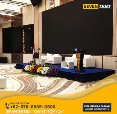 Sewa panggung backdrop Bekasi di Seventent.id menyediakan panggung modular dengan tinggi mulai dari 20 cm menggunakan panel multiplek tebal dan rangka besi yang kokoh. Tersedia juga jasa pembuatan backdrop custom dengan rangka kayu atau besi, finishing cetak flexy high-res, kain, hingga melamin. Kami melayani seluruh wilayah Bekasi hingga Cikarang.