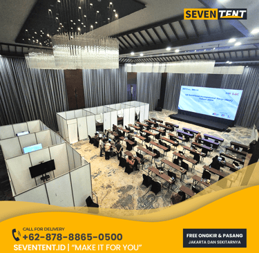 Butuh sewa partisi paketan Jabodetabek yang hemat & lengkap? Seventent.id menyediakan paket booth R8 sudah termasuk meja, kursi, karpet & listrik. Unit bersih, instalasi cepat, & siap antar ke Jakarta hingga Cikarang. Cek promo harga 2026 & buat pameran Anda makin profesional di sini!