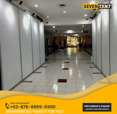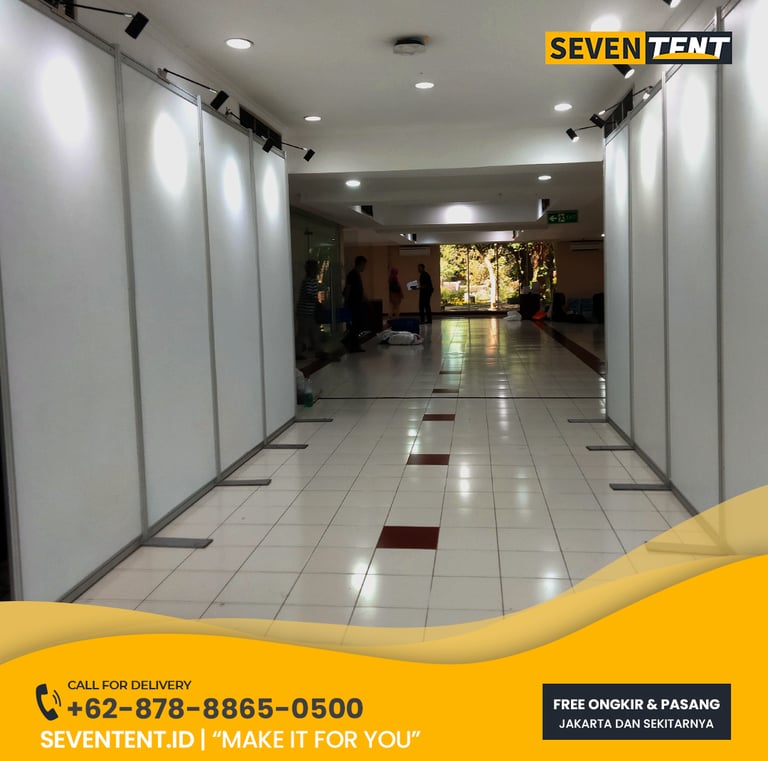Sewa partisi pameran di Karawang menggunakan sistem R8 modular dengan ukuran standar 2x2 meter dan 3x3 meter. Karakteristik utamanya meliputi rangka aluminium perak, dinding panel laminasi putih (polywood), dan kemudahan kustomisasi branding. Dari sisi durability, partisi ini sangat stabil, tahan api ringan, dan mampu menahan beban display produk hingga 15kg per panel. Seventent.id melayani kebutuhan booth pameran di Karawang Barat, Timur, hingga kawasan industri KIIC.