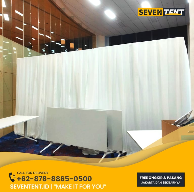 Butuh sewa partisi tirai Bekasi yang rapi & tanpa paku dinding? Seventent.id menyediakan penyekat ruang sistem pipe and drape dengan kain premium (Blackout/Velvet). Unit bersih, steam-pressed, & siap antar ke Cikarang hingga Summarecon. Cek promo harga 2026 & tata ruangan Anda secara fleksibel di sini!
