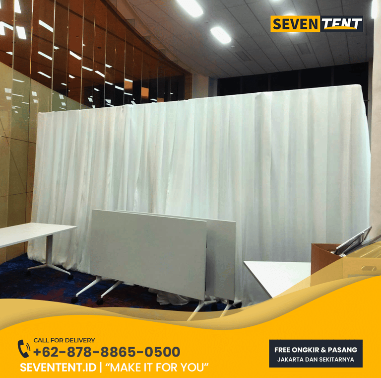 Sewa partisi tirai Depok di Seventent.id menyediakan penyekat ruangan menggunakan sistem Pipe and Drape yang mandiri (self-standing). Tersedia berbagai pilihan kain seperti Lototto (Blackout) untuk privasi total dan Habutai untuk kesan dekoratif. Kami melayani wilayah Margonda, Beji, GDC, hingga Sawangan.