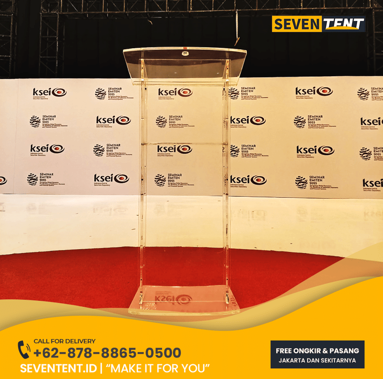 Butuh sewa podium acrylic Jabodetabek yang mewah & jernih? Seventent.id menyediakan rental podium akrilik premium untuk pidato & event panggung. Unit mulus tanpa noda sidik jari, kokoh, & siap antar ke Jakarta hingga Bogor. Cek promo harga 2026 & hadirkan kesan modern di acara Anda di sini!
