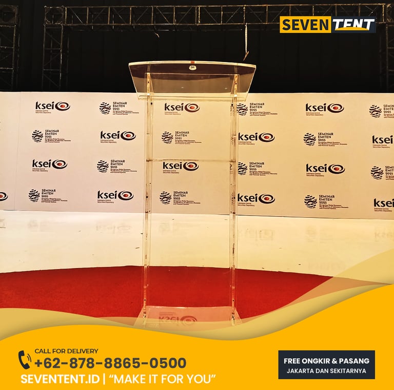 Butuh sewa podium acrylic Tangerang Selatan yang mewah & bening kristal? Seventent.id menyediakan rental mimbar transparan premium untuk event di BSD, Bintaro & Serpong. Unit mulus, kokoh, & siap antar tepat waktu. Cek promo harga 2026 & buat tampilan panggung Anda makin futuristik di sini!