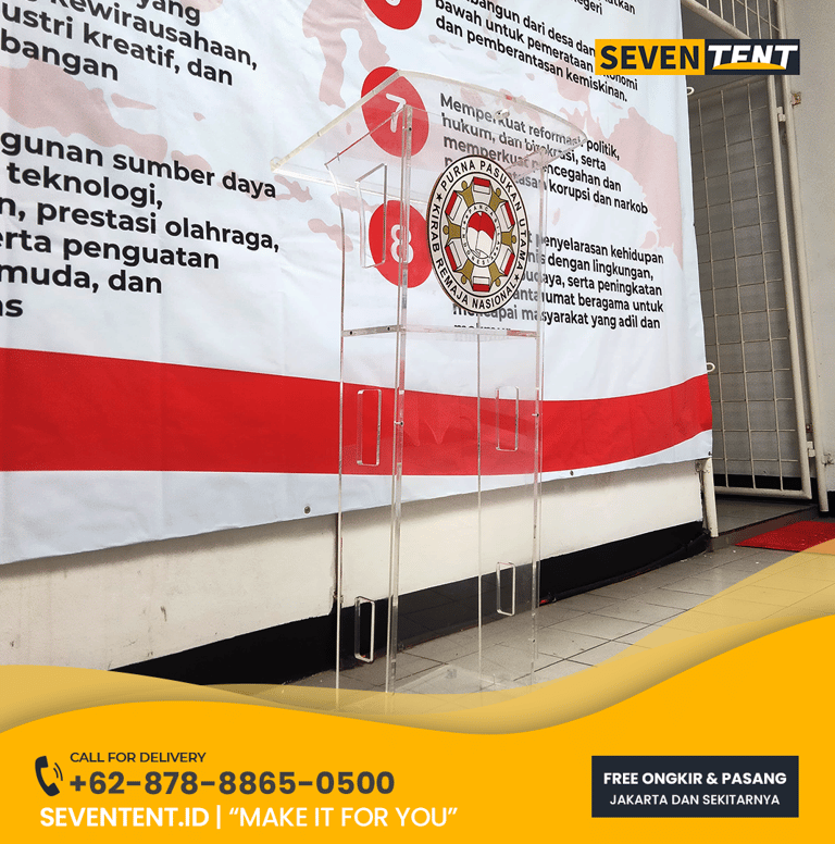 Butuh sewa podium akrilik di Jakarta? Seventent.id menyediakan sewa podium transparan premium, bersih, dan kokoh untuk event VIP & seremonial. siap pasang logo. Kirim cepat ke seluruh wilayah Jakarta, Jakarta Utara, Jakarta Timur, Jakarta Selatan, Jakarta Barat, Jakarta Pusat. Cek harga sewa podium akrilik terbaru dan spesifikasinya di sini!