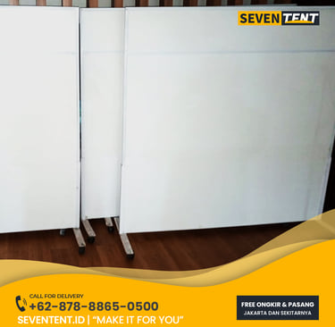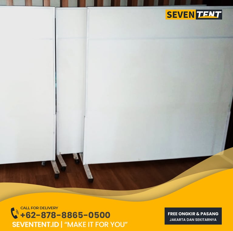 Sewa partisi beroda di Tangerang menyediakan panel penyekat berbahan rangka aluminium R8 atau kayu dengan sistem roda putar 360 derajat. Karakteristik utamanya meliputi fitur wheel lock (rem), ketinggian standar 2 meter, dan permukaan panel yang dapat ditempel informasi. Dari sisi durability, partisi ini stabil dan mampu menahan getaran saat digerakkan. Seventent.id melayani wilayah Tangerang Selatan, Tangerang Kota, hingga area industri Balaraja dengan unit yang selalu bersih dan roda yang lancar.