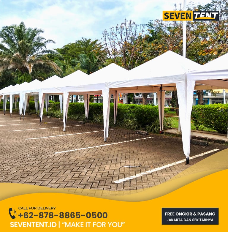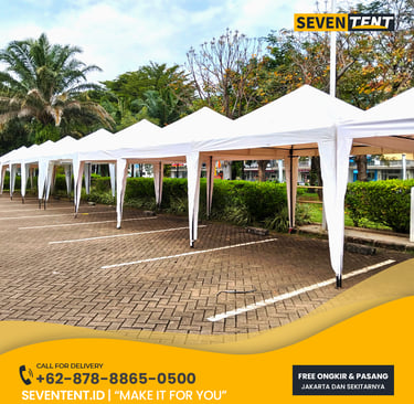 Sewa tenda bazar Jakarta di Seventent.id, Tenda kami menggunakan material atap PVC yang 100% tahan air (waterproof) dan rangka besi/aluminium anti-karat. Layanan kami mencakup pengiriman ke seluruh wilayah Jakarta dengan sistem sewa harian hingga mingguan yang sudah termasuk jasa instalasi dan bongkar tepat waktu.