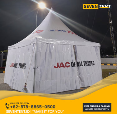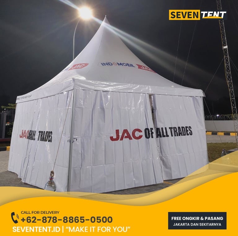 Sewa tenda sarnafil 5x5 di Karawang menyediakan unit tenda kerucut premium. Karakteristik utamanya meliputi rangka aluminium alloy tebal antikarat, atap PVC blockout 100% waterproof, dan dinding yang dapat dibuka-tutup. Dari sisi durability, tenda ini memiliki ketahanan angin yang sangat baik untuk area lapangan terbuka. Seventent.id melayani pengiriman ke Karawang Barat, Timur, Klari, hingga seluruh kawasan industri utama.