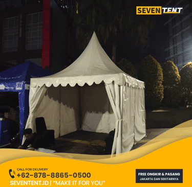 Butuh sewa tenda kerucut Bekasi yang mewah & adem? Seventent.id menyediakan tenda sarnafil 3x3 & 5x5 kualitas premium. Atap PVC blockout, rangka aluminum kokoh, & unit putih bersih. Siap antar ke Cikarang, Tambun, hingga Summarecon. Cek promo 2026 & buat event Anda terlihat profesional di sini!