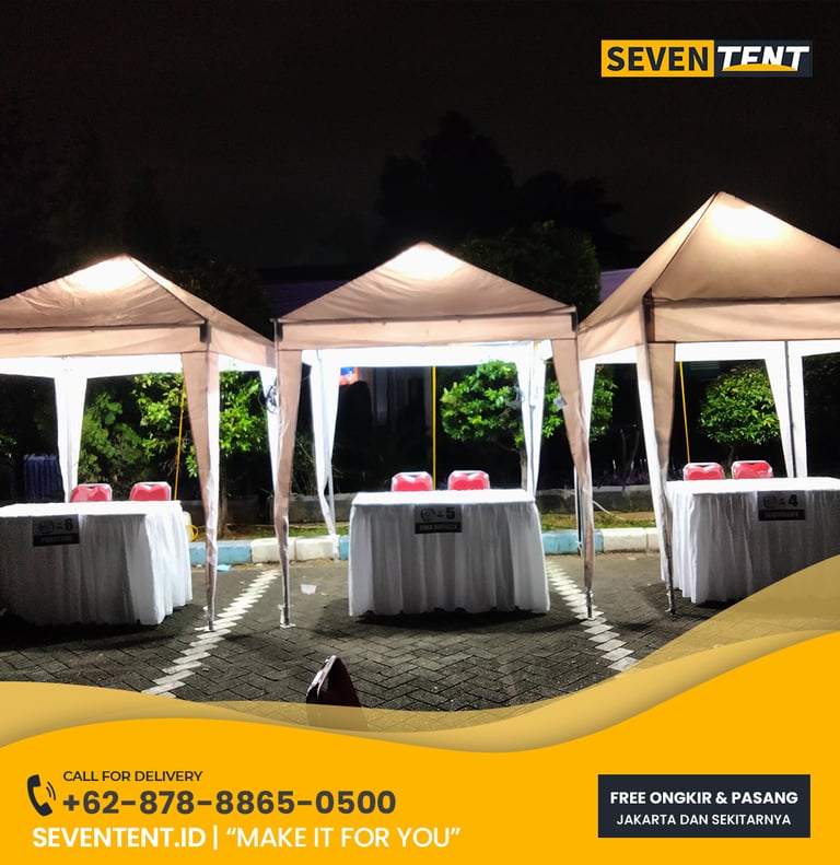 Sewa tenda murah Depok di Seventent.id menawarkan berbagai pilihan tipe tenda mulai dari Tenda Tratak (Plafon), Tenda Kerucut (Sarnafil), hingga Tenda Roder dengan harga yang sangat kompetitif. Memiliki karakteristik material rangka pipa besi/aluminium yang kokoh dan atap terpal PVC kedap air. Kami melayani wilayah Margonda, Beji, Sawangan, hingga Cimanggis.