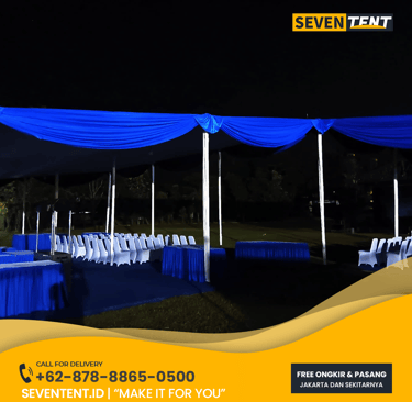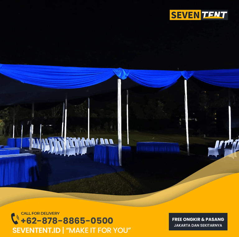 Sewa tenda plafon Depok di Seventent.id menawarkan tenda konvensional dengan dekorasi atap rata (flat) menggunakan kain habutai atau sateen putih bersih. Tenda ini didukung rangka pipa besi heavy-duty dan lapisan atap terpal karet yang 100% waterproof. Sangat ideal untuk area dengan lahan terbatas seperti halaman rumah atau jalanan di wilayah Depok. Kami melayani area Beji, Margonda, Cinere, hingga Sawangan.