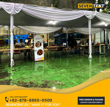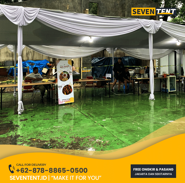 Sewa tenda plafon Jakarta di Seventent.id, Tenda ini menggunakan rangka besi pipa galvanis yang kokoh dengan atap PVC waterproof dan dekorasi kain plafon (putih atau kombinasi warna) yang bersih dan tidak kusam. Layanan sudah termasuk transportasi, instalasi profesional, dan pembongkaran tepat waktu.