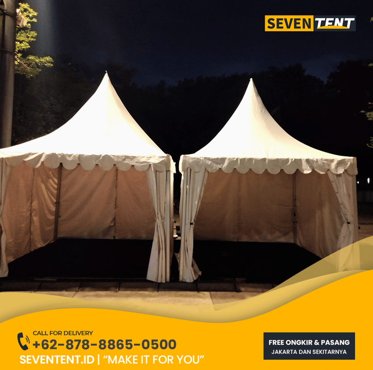 Sewa tenda sarnafil 3x3 Jakarta di Seventent.id menyediakan tenda kerucut dengan dimensi tepat 3x3 meter. Dilengkapi dengan 4 sisi dinding penutup fleksibel, tenda ini ideal untuk booth registrasi, stan kuliner, atau posko informasi di wilayah Jakarta dengan jaminan kondisi kain yang selalu putih bersih.