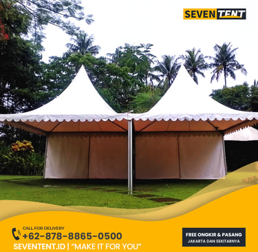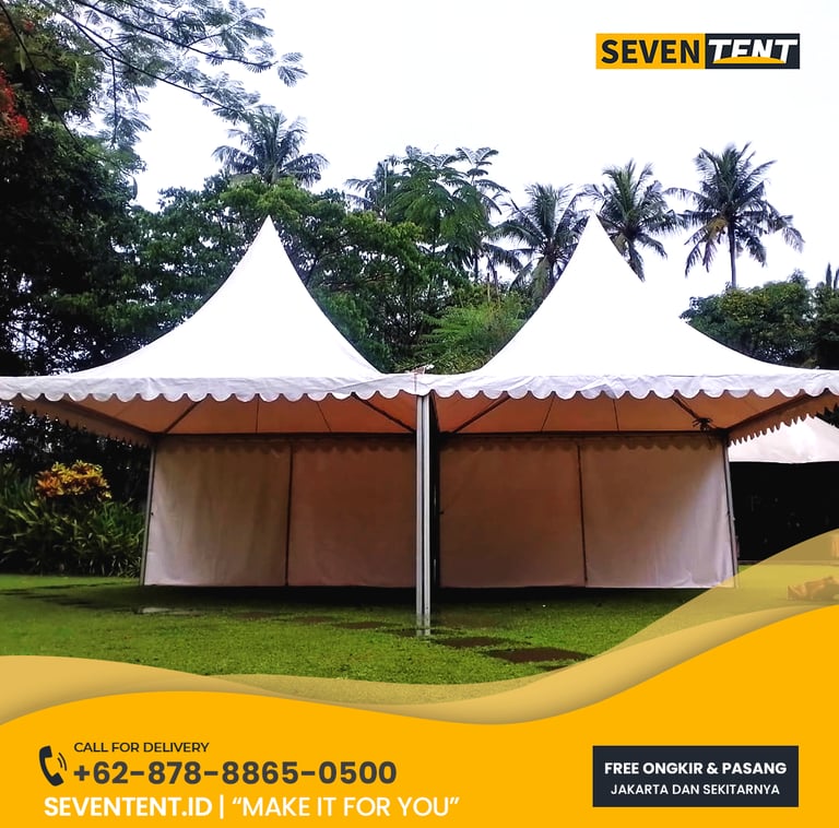 Sewa tenda sarnafil 5x5 Jabodetabek di Seventent.id menyediakan unit tenda kerucut premium. Memiliki karakteristik rangka aluminum antikarat yang sangat stabil dan atap PVC tebal. Kami melayani seluruh Jakarta, Bogor, Depok, Tangerang, dan Bekasi.