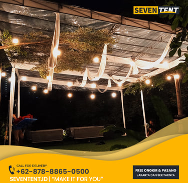 Sewa tenda di Tangerang mencakup berbagai pilihan seperti Tenda Roder (bentang lebar), Tenda Sarnafil (kerucut), dan Tenda Dekorasi untuk pernikahan. Karakteristik utamanya meliputi penggunaan rangka aluminium antikarat, atap PVC blockout yang tahan panas, serta sistem modular. Dari sisi durability, tenda kami dirancang stabil untuk menahan hembusan angin di area terbuka. Seventent.id melayani wilayah Tangerang Selatan (BSD/Bintaro), Tangerang Kota, hingga Kabupaten Tangerang.