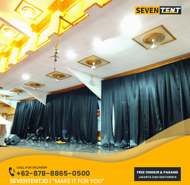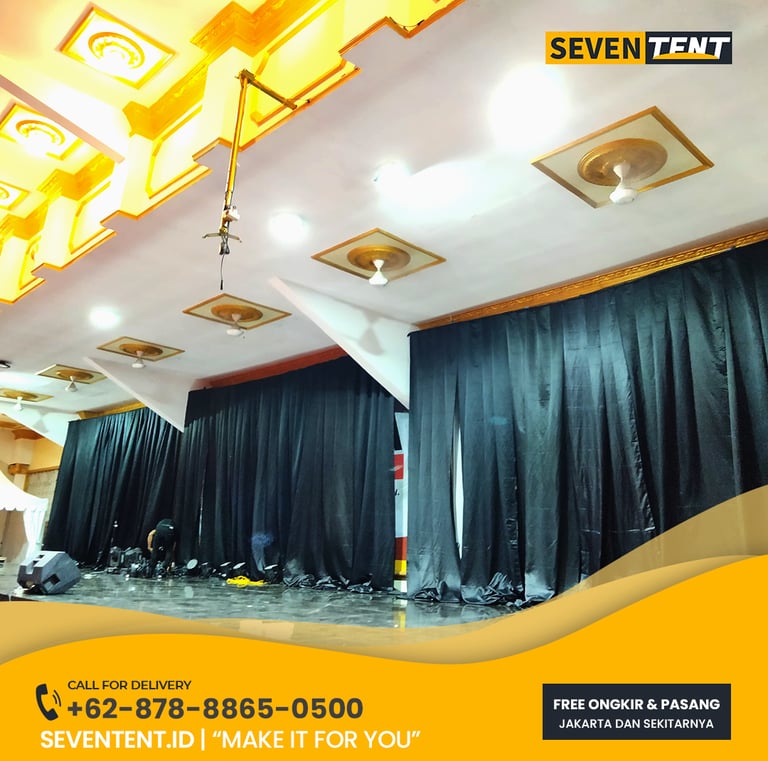 Sewa tirai dekorasi Depok di Seventent.id menyediakan layanan penutup dinding dan backdrop menggunakan kain jenis Lototto (Blackout), Habutai, atau Velvet yang dipasang menggunakan rangka rigging atau tiang stand teleskopik. Memiliki karakteristik kain yang jatuh sempurna (draping), bersih, dan tidak kusam. Kami melayani wilayah Margonda, Beji, Sawangan, hingga Cinere.