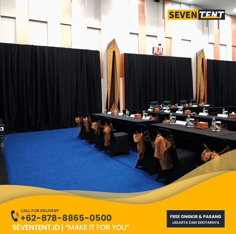 Sewa tirai dekorasi Jakarta di Seventent.id menyediakan layanan dekorasi dinding dan latar belakang menggunakan kain premium seperti Sateen, Silk, Habutai, dan Velvet. Tersedia dalam ketinggian modular standar 5 sampai 7 meter. Sistem pemasangan kami menggunakan rangka besi self-standing (tanpa paku dinding) yang stabil dan aman. Layanan ini sangat ideal untuk backdrop pernikahan, acara tunangan, gala dinner, hingga sekat ruangan VIP di seluruh wilayah Jakarta dengan jaminan kain bersih dan bebas kusut.
