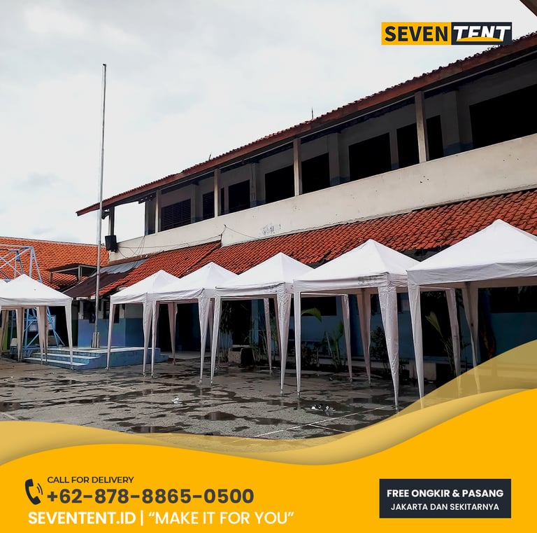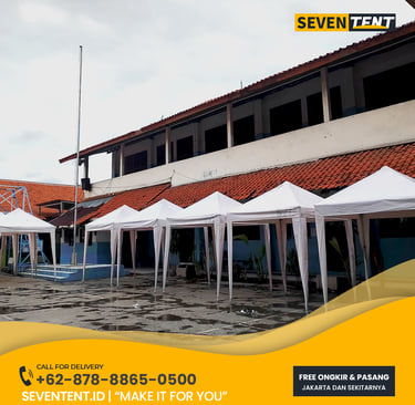 Sewa tenda bazar di Karawang umumnya menggunakan tipe Tenda Sarnafil 3x3 atau 5x5 dan Tenda Kafe/Bazaar 2x2 atau 3x3. Karakteristik utamanya meliputi rangka aluminium/besi antikarat, atap PVC waterproof, dan dinding yang bisa dibuka-tutup. Dari sisi durability, tenda bazar kami dirancang stabil menghadapi angin kencang di area terbuka. Seventent.id melayani pengiriman ke Karawang Barat, Timur, hingga seluruh kawasan industri dengan unit yang bersih dan siap pakai.