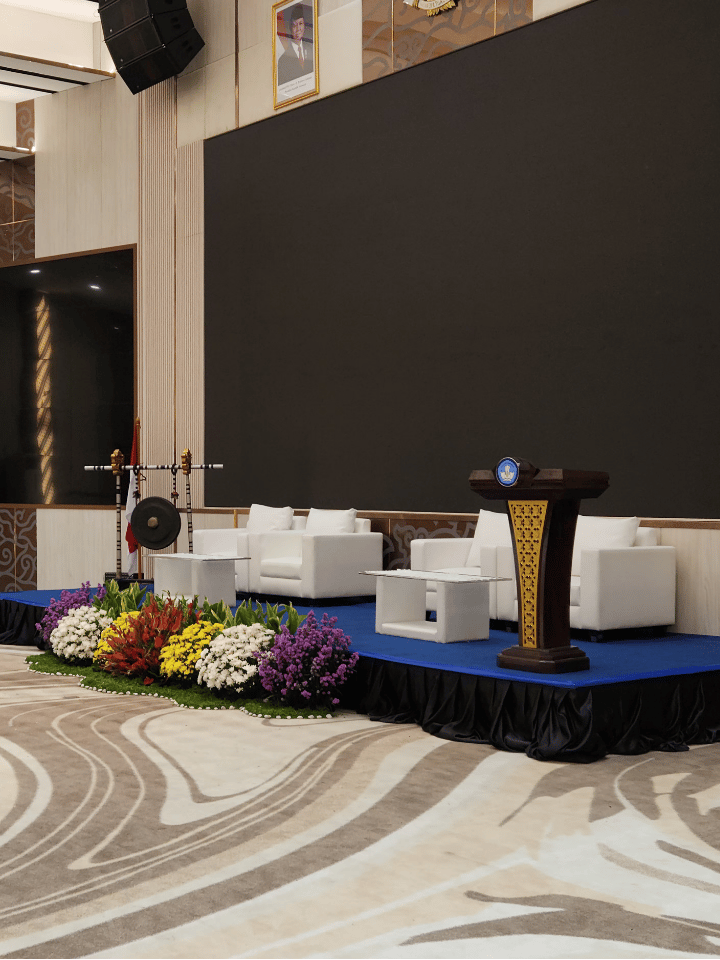 Tingkatkan kesan acara Anda dengan panggung modular, podium elegan, dan backdrop custom. Ideal untuk seminar, konser, talkshow, dan presentasi perusahaan.