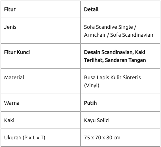 Satu unit Single Sofa Scandive memiliki berat sekitar 15 - 20kg. Cukup kokoh untuk tidak mudah bergeser saat diduduki, namun masih cukup ringan untuk dipindahkan oleh satu hingga dua orang saat Anda ingin mengubah tata letak ruangan.