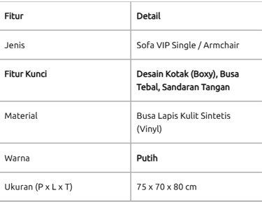 Ukuran Sofa VIP Single kami memiliki ukuran 75cm x 70cm x 80. Sofa VIP biasanya menggunakan material kulit sintetis (oscar) berkualitas tinggi untuk memberikan kesan mewah sekaligus mudah dibersihkan.