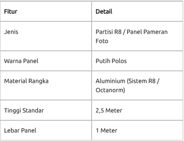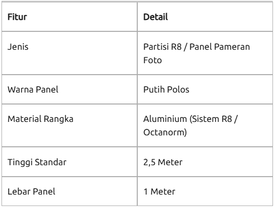 Kamu tahu tidak? Partisi pameran standar umumnya menggunakan Sistem R8 dengan ukuran panel per modul lebar 100 cm dan tinggi 250 cm. Biasanya booth paling umum di gunakan dalama event acara loh, Material utamanya menggunakan rangka aluminium dan dinding laminboard atau polywood putih yang kokoh namun mudah dibongkar-pasang.
