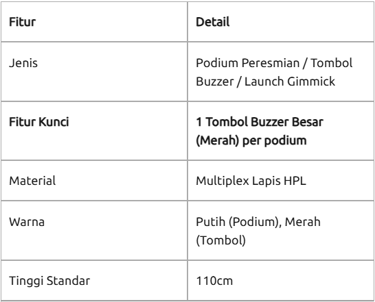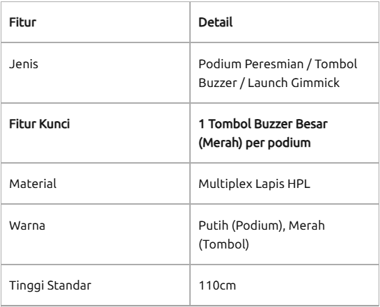 Podium sirine adalah mimbar khusus seremoni yang dilengkapi dengan tombol tekan (push button) dan sistem sirine terintegrasi untuk prosesi peresmian. Ukuran standar podium ini memiliki tinggi 110cm. Podium ini dirancang untuk memicu suara sirine atau efek lampu secara instan, memberikan kesan dramatis pada puncak acara peluncuran atau grand opening.