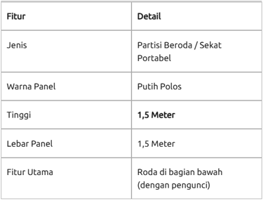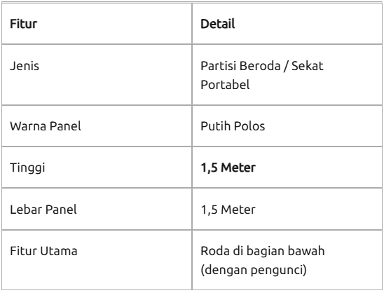 "Partisi beroda adalah pembatas ruangan portabel dengan tinggi 150 cm. dengan rangka aluminium atau besi ringan dan roda heavy-duty dengan sistem pengunci (lockable wheels), partisi ini dirancang untuk kemudahan mobilitas. Tinggi 1,5 meter adalah ukuran ideal yang memberikan privasi visual tanpa membuat ruangan terasa sempit atau pengap."