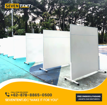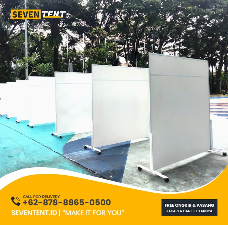 Cek spesifikasi partisi beroda 150cm, dimensi lengkap, dan material penyekat ruangan portable di Seventent.id. Solusi pembatas ruangan fleksibel untuk event, kantor, dan pameran. Dilengkapi roda pengunci dan frame kokoh. Dapatkan panduan ukuran dan kebutuhan sewa Anda di sini!