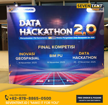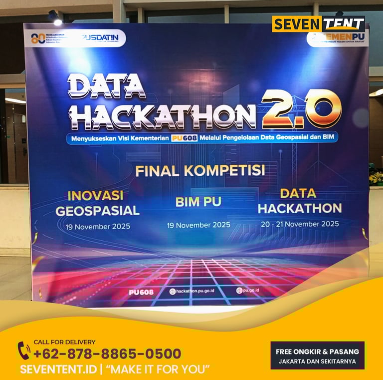 Sewa backdrop Jakarta di Seventent.id menyediakan jasa pembuatan dan pemasangan backdrop custom dengan pilihan material Flexy High-Res, Flexy Matte (Anti-Pantul), hingga Kain Canvas. Paket sewa sudah termasuk transportasi, lampu sorot (spotlight), dan tenaga pasang-bongkar profesional untuk seluruh wilayah Jakarta (Pusat, Selatan, Barat, Timur, Utara).