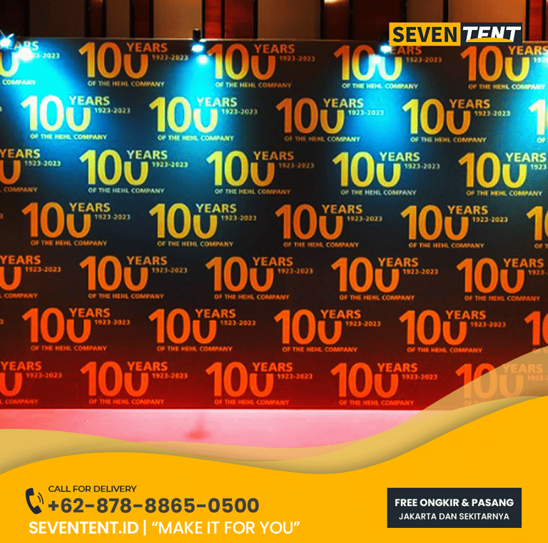 Sewa backdrop panggung Depok di Seventent.id menggunakan rangka besi hollow yang modular dan kokoh, melayani ukuran kustom sesuai luas panggung. Layanan kami sudah termasuk jasa desain (opsional), cetak, pemasangan tepat waktu, hingga pembongkaran. Kami menjangkau seluruh wilayah Depok (Margonda, Beji, Sawangan, hingga Cimanggis).